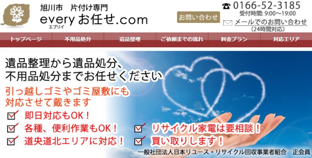 業者名Crysta(クリスタ)しあわせの遺品整理 ネクステップ 想いてリライブル 北海道片付け110番 エコプラン everyお任せ.com旭川一般廃棄物処理社 丸忠北都清掃㈱
