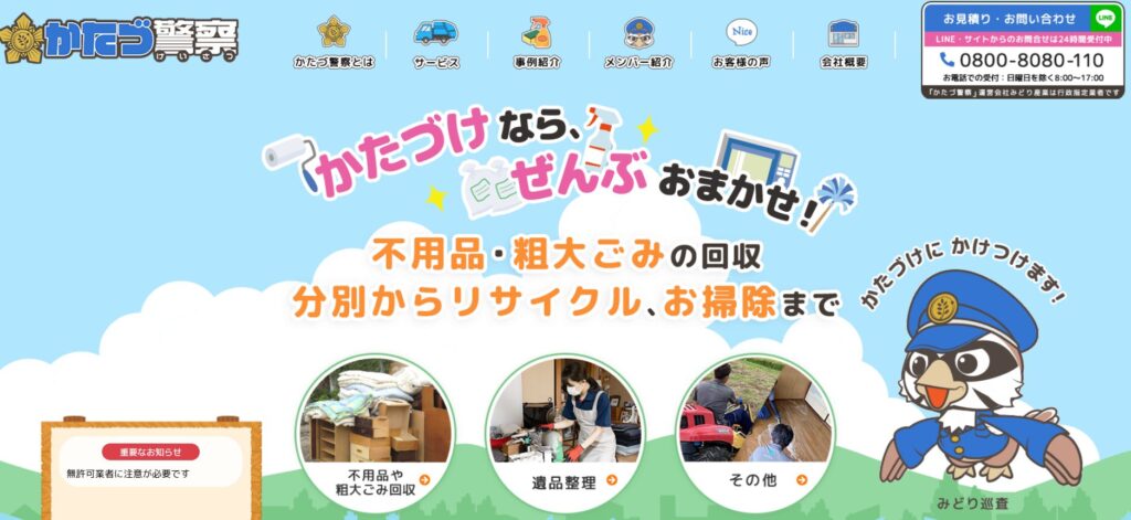 | サービス内容 | 不用品回収・遺品整理・ゴミ屋敷汚部屋清掃・ハウスクリーニング・整理整頓・エアコンクリーニング:取り外し・仕分け・供養お焚き上げ・引越し・特殊清掃 |