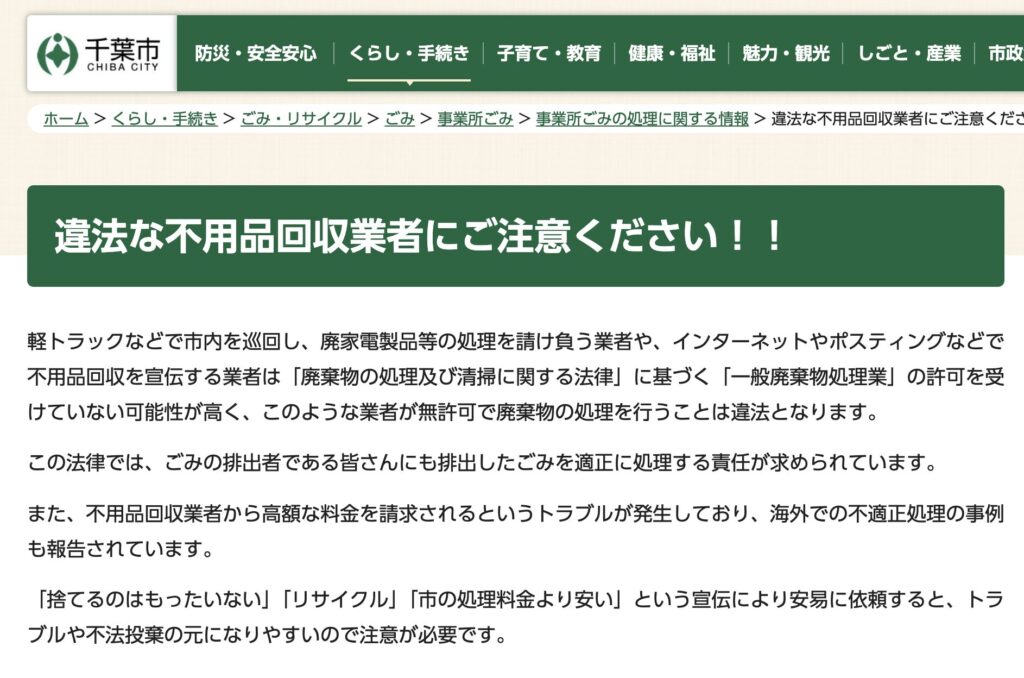 千葉市の公式サイトでも同様の注意喚起がされており、違法な不用品回収業者を利用しないよう市民に呼びかけています。