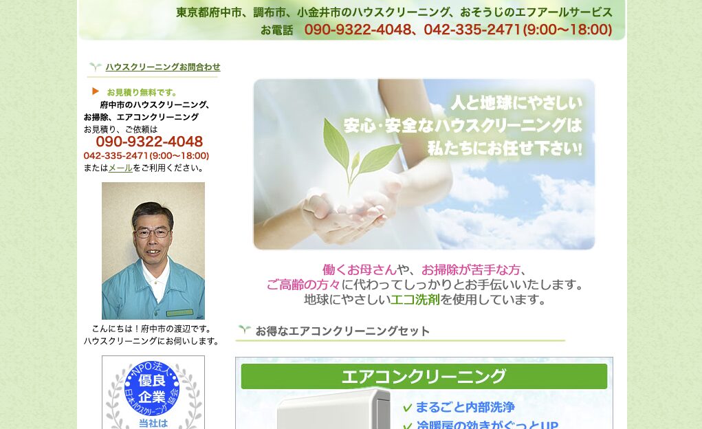 エフアールサービスは、府中市、調布市、小金市のハウスクリーニングを中心にサービスを提供しており、日本ハウスクリーニング協会認定の優良企業と認定されています。