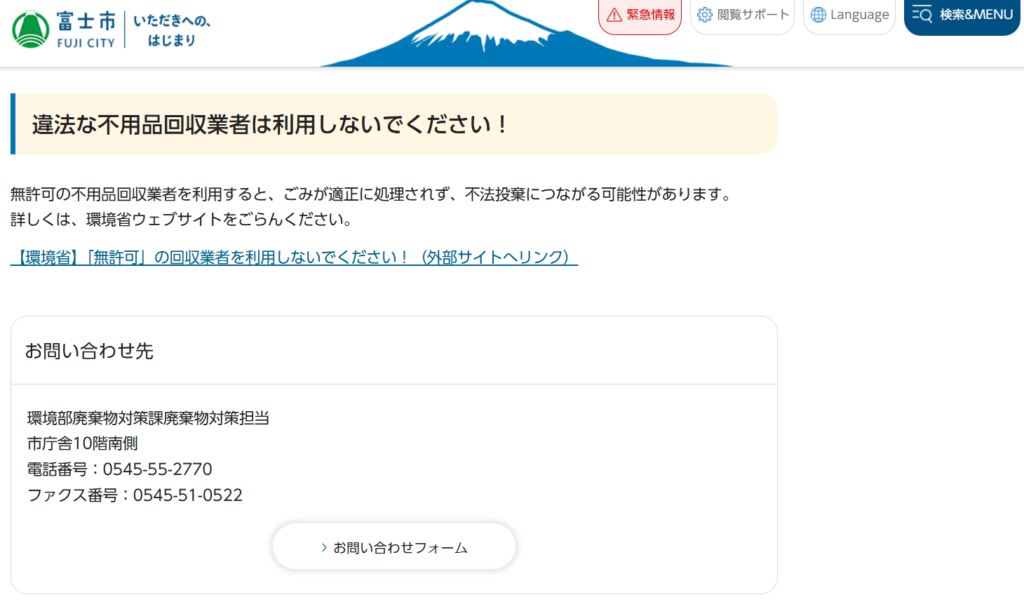 許可のない業者による不用品回収は法律違反となり、不法投棄や高額請求などのトラブルにつながりかねません。こうした被害を防ぐため、富士市も公式サイトで次のような注意喚起を行っています。