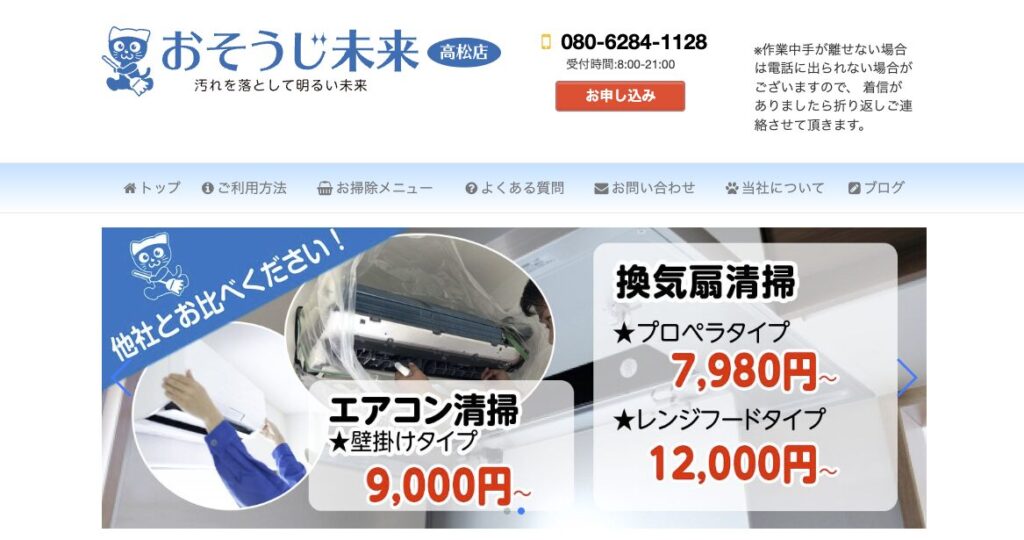 | 業者名 | ![]() ユアマイスター | ![]() カジタク | おそうじ本舗 | お掃除革命 | ![]() ダスキン | ![]() あぐりクリーン | ![]() おそうじ未来 | ![]() Pure Assist | ![]() Neo Climb | ![]() くらしのマーケット |