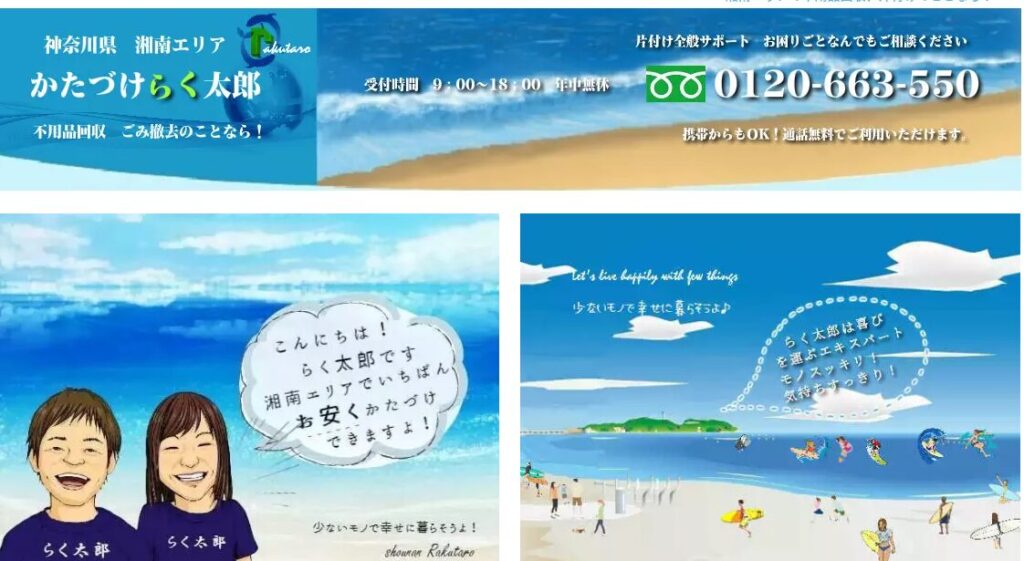 かたづけらく太郎は神奈川県に対応する片付け業者です。地域密着で対応エリアを湘南地域のみに狭めているため、出張移動時間の短縮、運搬時間、諸経費をできる限りおさえた低コストパフォーマンスが魅力です。