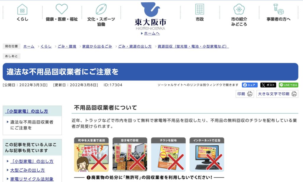 引用:違法な不用品回収業者にご注意を|東大阪市