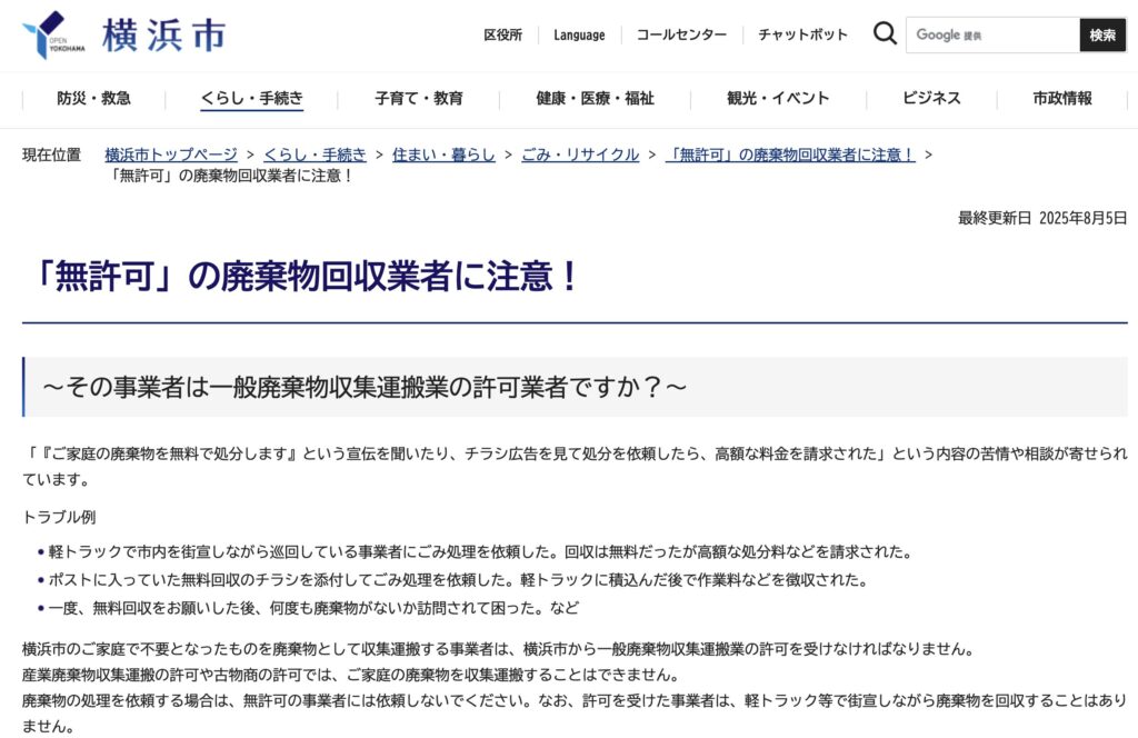 引用:「無許可」の廃棄物回収業者に注意!|横浜市公式