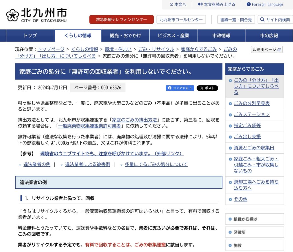 引用:家庭ごみの処分に「無許可の回収業社」を利用しないでください。|北九州市公式