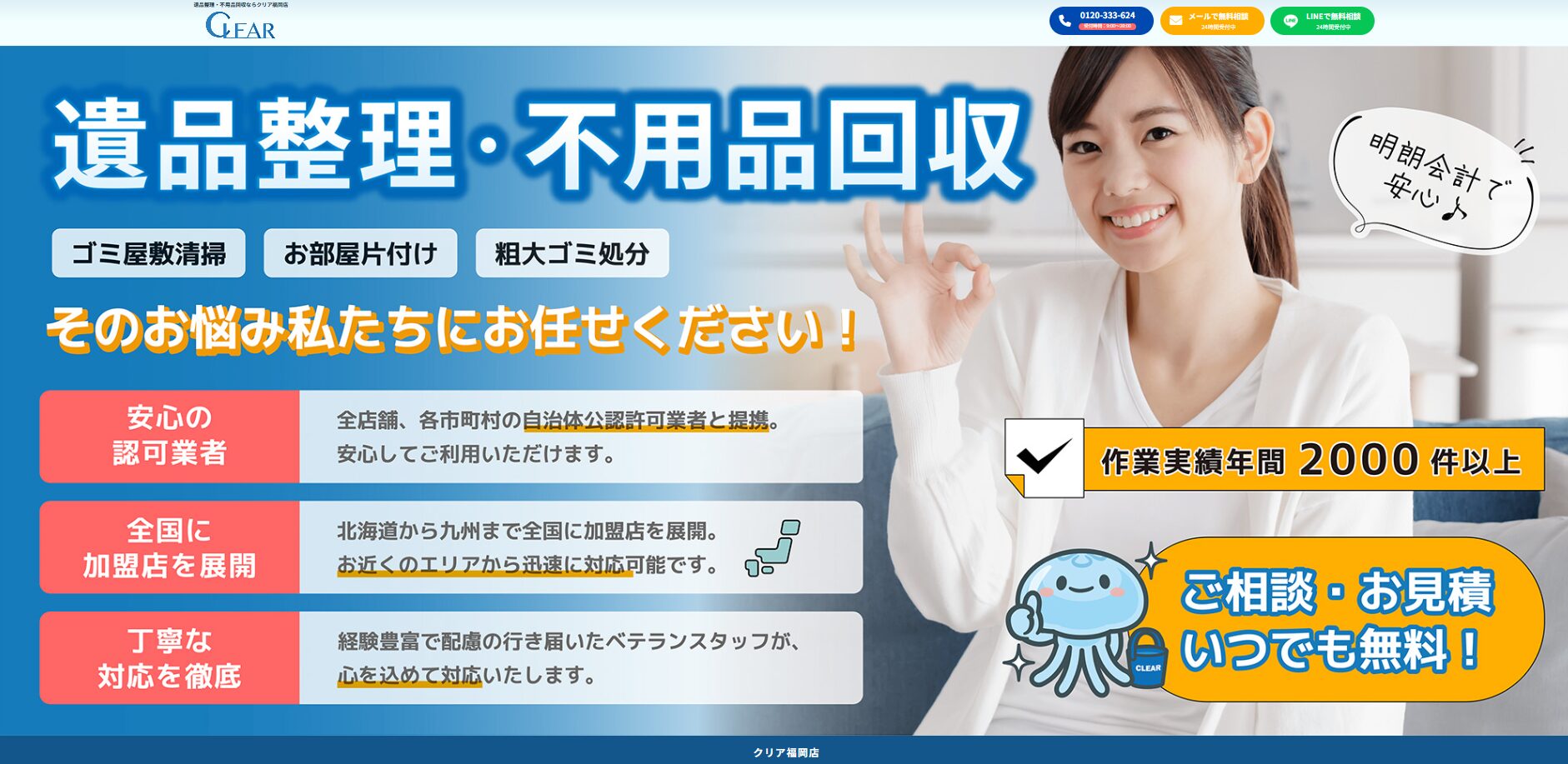 もし「どの業者に頼めばいいかわからない…」「まずは話だけ聞きたい」という場合は、当サイト「クリア」でも遺品整理のご相談を承っています。無料で訪問見積もりも対応していますので、お気軽にお問い合わせください。