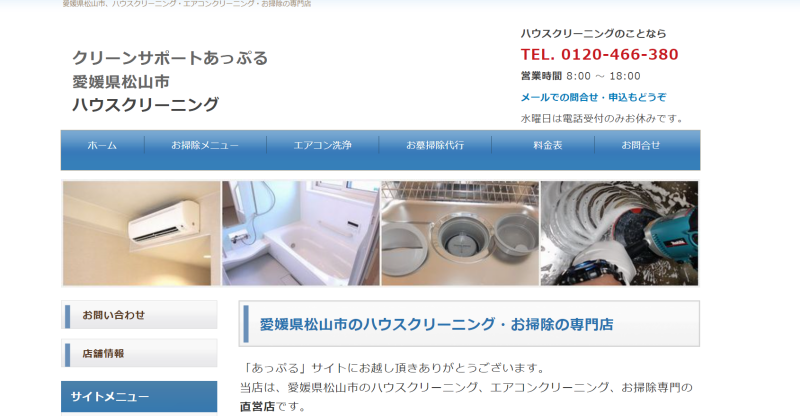 クリーンサポートあっぷるは、愛媛県松山市を中心に活動するお掃除専門の直営店で、エアコンクリーニングやお墓掃除などのサービスを提供している業者です。壁掛けエアコンからお掃除機能付きエアコン、業務用エアコンまでさまざまな種類のエアコンクリーニングに対応しています。