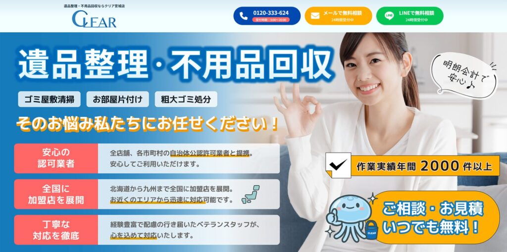 もし「どの業者に頼めばいいかわからない…」「まずは話だけ聞きたい」という場合は、当サイト「クリア」でも遺品整理のご相談を承っています。無料で訪問見積もりも対応していますので、お気軽にお問い合わせください。