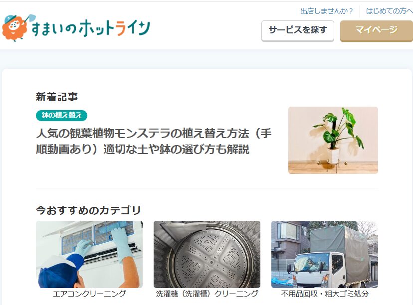すまいのホットラインは、エアコンクリーニングから家事代行、不用品回収、リフォームまで、らしにまつわる200種類以上のサービスをまとめて検索・予約できるサイトです。。地域のプロ業者を口コミや料金で比較できるので、「誰に頼めばいいの?」という悩みをスムーズに解消してくれます。