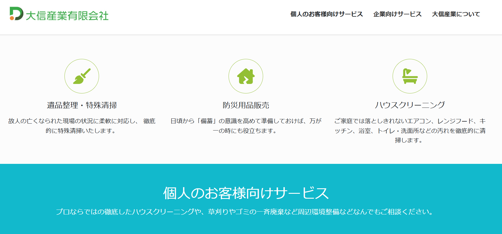 個人向けにはエアコンやレンジフード、浴室などの徹底クリーニング、草刈りやごみの一斉処分など幅広い生活サポートを用意。遠方からの利用者にも、空き家管理や地域事業者との連携による一括見積りで対応するなど、柔軟な姿勢が特徴です。