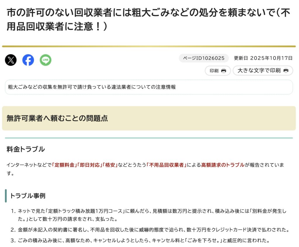 中には無許可のまま回収を行う業者も存在しますが、それは法律違反にあたります。法令を守らない業者は、料金トラブルや不法投棄といったリスクも否定できません。実際に名古屋市でも、無許可業者との契約による高額請求などについて注意喚起が行われています。