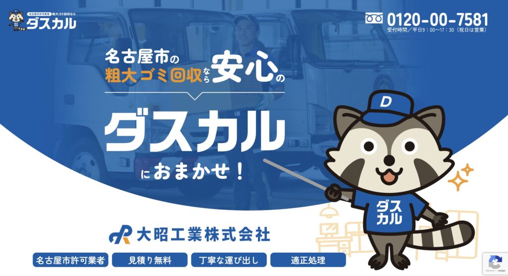 ダスカルは、名古屋市の許可を受けた大昭工業株式会社が提供する粗大ごみ・不用品回収サービスです。1965年創業の地元企業として、法律に準じた適正な回収・処理と個人情報の厳重管理を掲げ、運び出しから片付けまで丁寧かつスピーディに対応します。