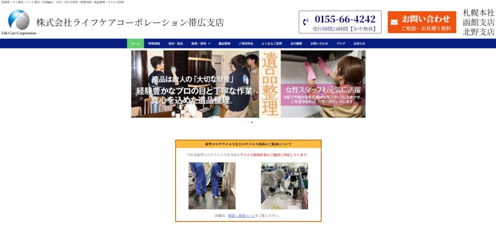 ライフケアコーポレーションは、北海道十勝エリアを対象に、片付け、遺品整理、特殊清掃、消臭・脱臭サービスを提供する業者です。孤独死や事故現場、ゴミ屋敷の清掃など、その他業者では対応が難しい特殊な作業にも対応している点が特徴です。
