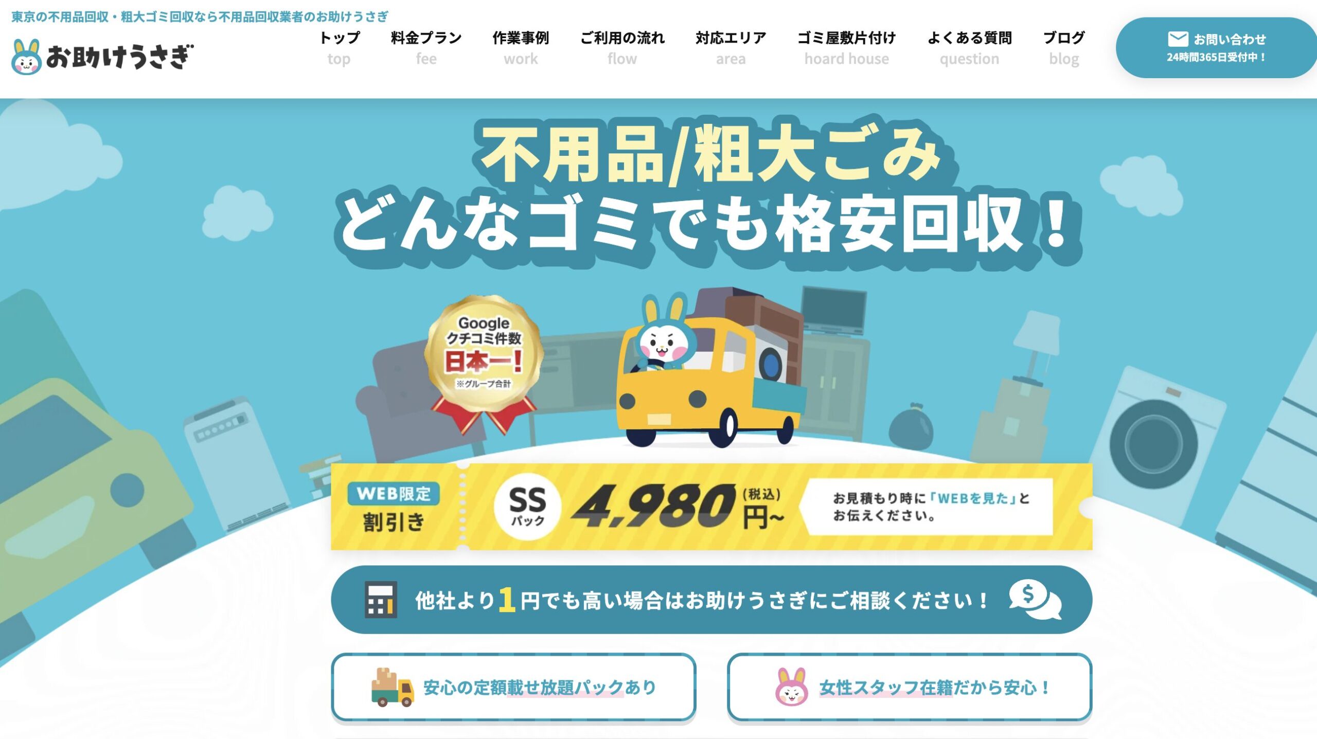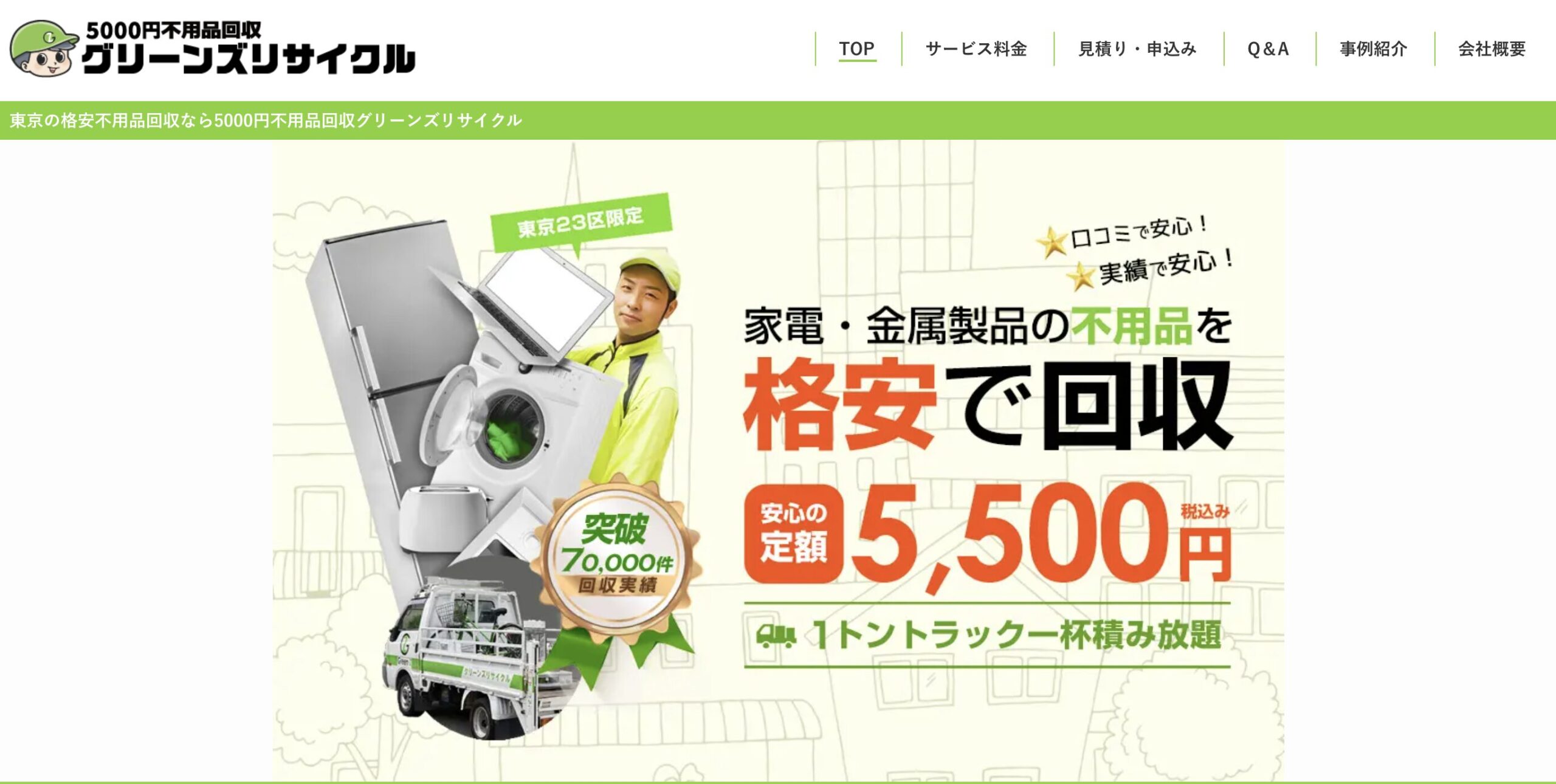 | 最安値プラン | 少量回収 5,000円〜 | ミニパック(小) 5,500円~ | くまトラSS 12,000円~ |