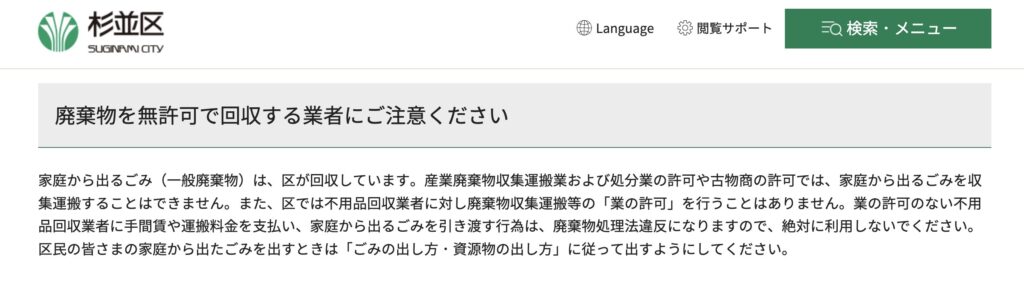 引用:無許可の廃棄物回収業者を利用しないでください|杉並区公式