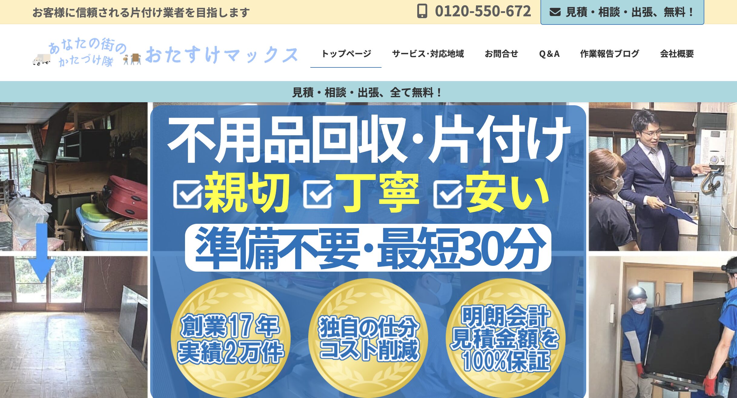 | 回収事例と料金の掲載 | 回収前後の写真付きで「タンス1竿、テレビ1台、合計○○円」など具体例を記載 |