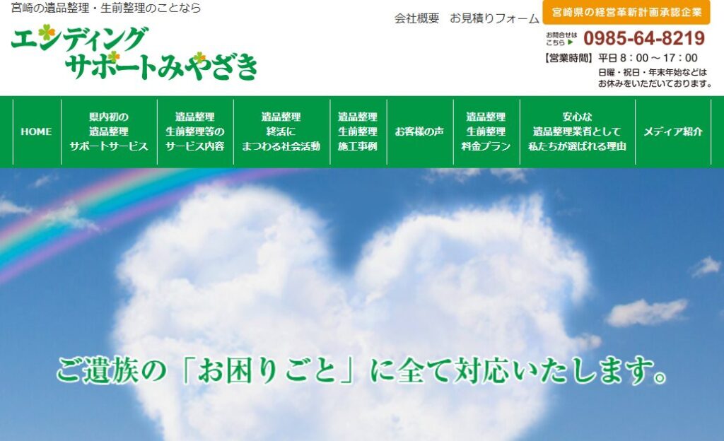 地域密着のトータルサポート!エンディングサポートみやざきエンディングサポートみやざきは、宮崎県に根ざした業者です。県内初の遺品整理サポートサービスを提供しており、長年の実績と信頼を誇ります。