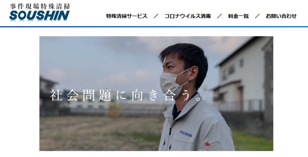 ソウシンは九州全域に対応する業者です。提供するサービスは、特殊清掃、消臭、脱臭、除菌、除染、原状回復工事、ハウスクリーニングなど多岐にわたります。特徴は特殊清掃の依頼を受けた際、迅速に対応できる「緊急処置パック」サービスを設けている点です。