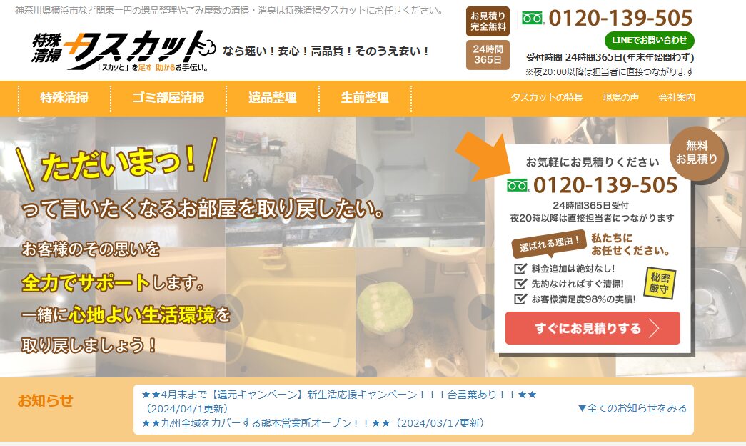 経済産業省が選定する「がんばる中小企業・小規模事業者300社」に選ばれた企業であり、その信頼性も折り紙付きです。特殊清掃のほか、遺品整理や生前整理、供養、不動産相談、リフォーム、解体まで幅広い対応が可能です。経験と実績がある業者をお探しの方におすすめします。