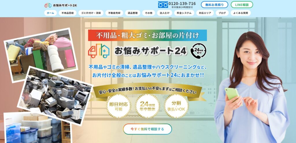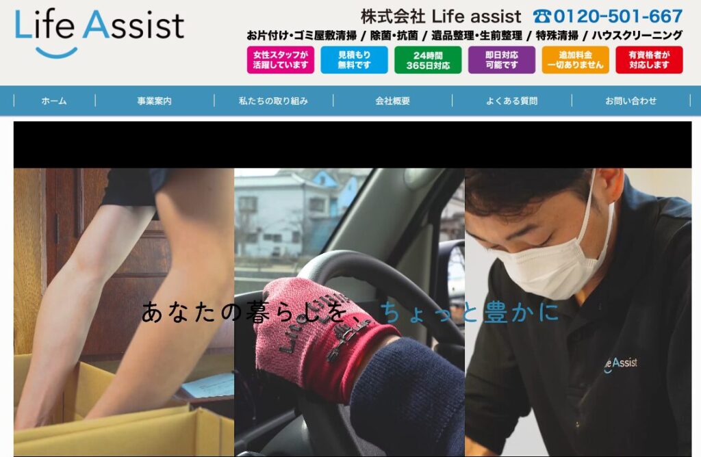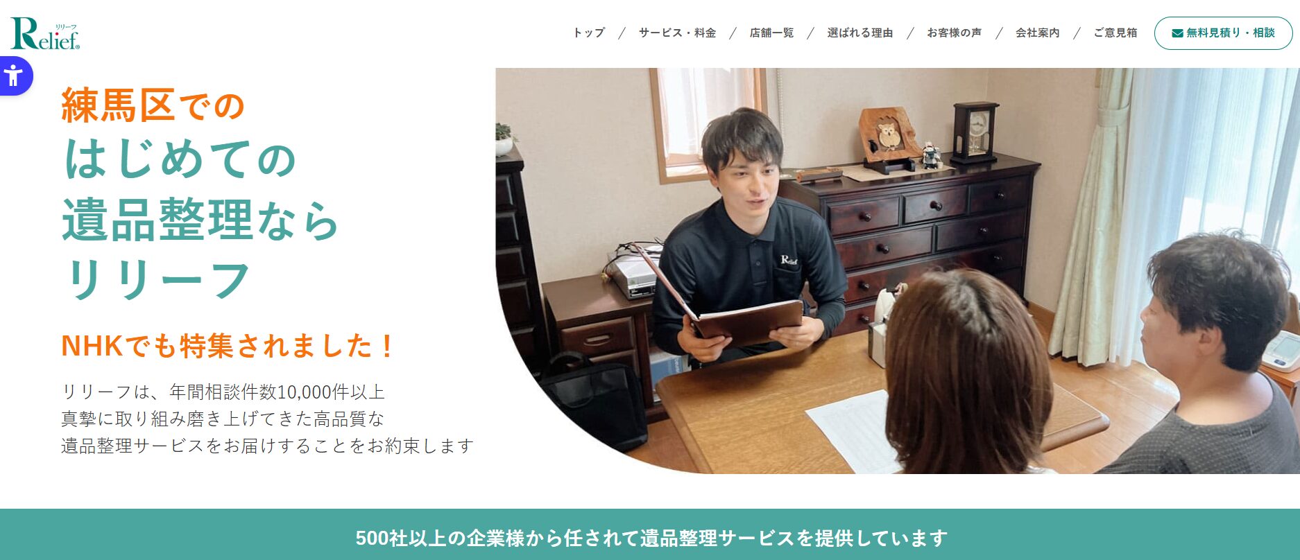 リリーフは、東京、神奈川、千葉、埼玉エリアでサービスを提供する業者です。特殊清掃、ゴミ屋敷の片付け、遺品整理、残置物撤去など、幅広いサービスを提供しています。特徴は、「NHKでも特集される信頼性」と「環境省主催の優良賞を受賞した実績」です。