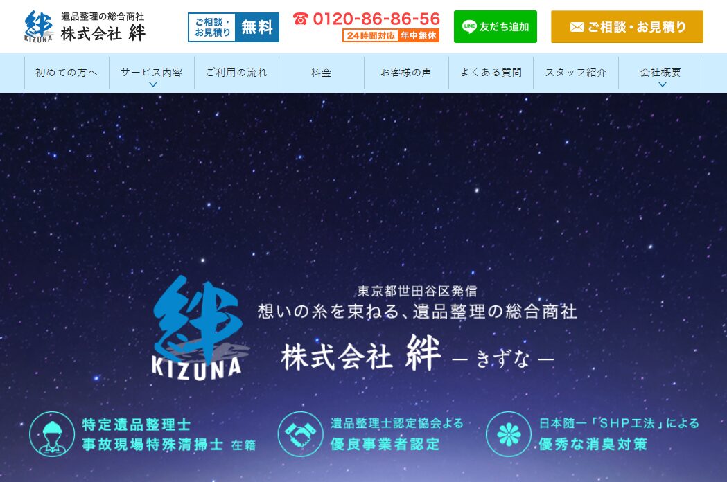 高性能な除菌消臭剤「ハイパーフレッシュ」を使用して、徹底的に清掃を行う点が強みです。また、遺品整理も同時に依頼できるため、清掃後の片付けに悩む必要がありません。