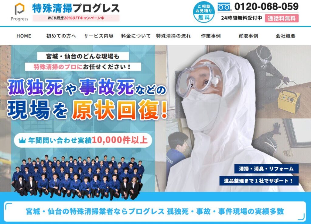 特殊清掃プログレスは、宮城県全域で特殊清掃サービスを提供する業者です。特殊清掃に加えて、遺品整理、リフォーム、ゴミ屋敷の片付け、不動産整理など幅広いサービスを1社で対応可能な点が特徴です。
