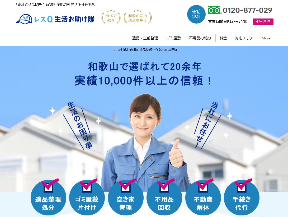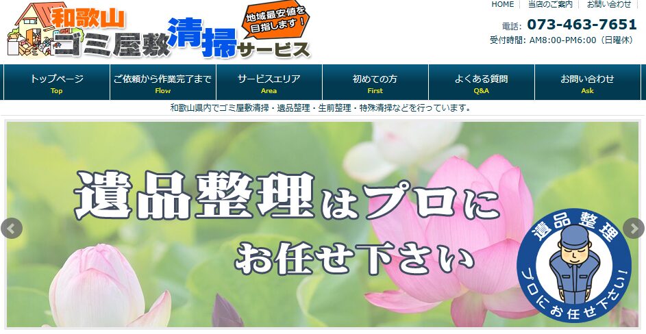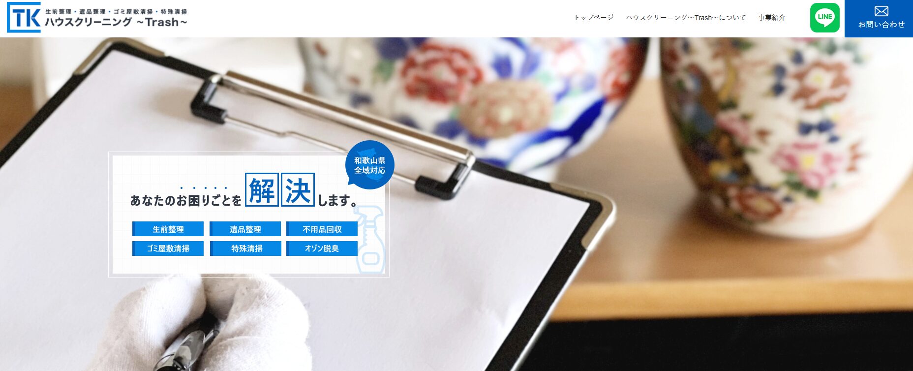 和歌山ゴミ屋敷清掃サービスは、和歌山県全域に対応する業者です。提供するサービスは幅広く、特殊清掃、ゴミ屋敷清掃、遺品整理、生前整理、不用品回収、ハウスクリーニングなどを行っています。