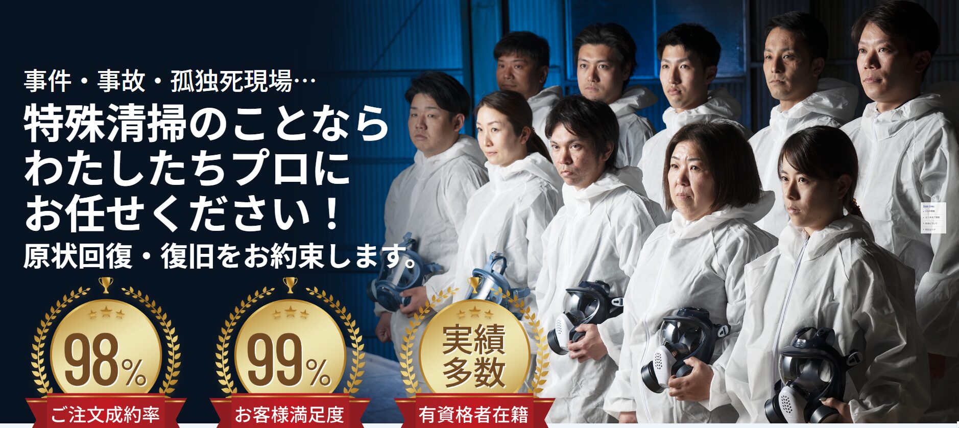 特殊案件施行士が在籍しており、孤独死や事故死が発生した現場でも、適切な清掃方法を提案し、迅速に対応します。特徴は遺品の買取サービスがある点です。不要になった遺品や電化製品を適正価格で買い取ることで、清掃費用の負担を軽減できます。特殊清掃とあわせて買取サービスを利用したい方におすすめの業者です。