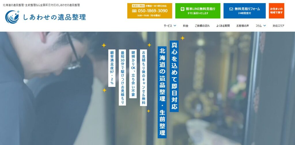 | 業者名 | CLEAR(クリア) | しあわせの遺品整理 | 北海道片付け110番 | お助けマスター | 想いて | おまかせネコの手 | (株)苫小牧清掃社 | (株)とませい |