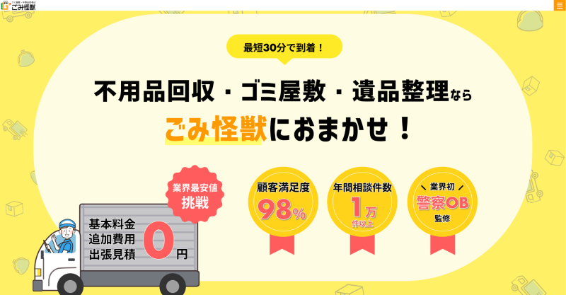 | 業者名 | ![]() クリア | ![]() 不用品回収いちばん | ![]() すぐ片付け隊 | ![]() 片付け110番 | ![]() くまのて | ![]() クリスタ | ![]() ごみ怪獣 | ![]() 有限会社山西 | ![]() プログレス | ![]() ココロセイリ | ![]() リユース本舗 |