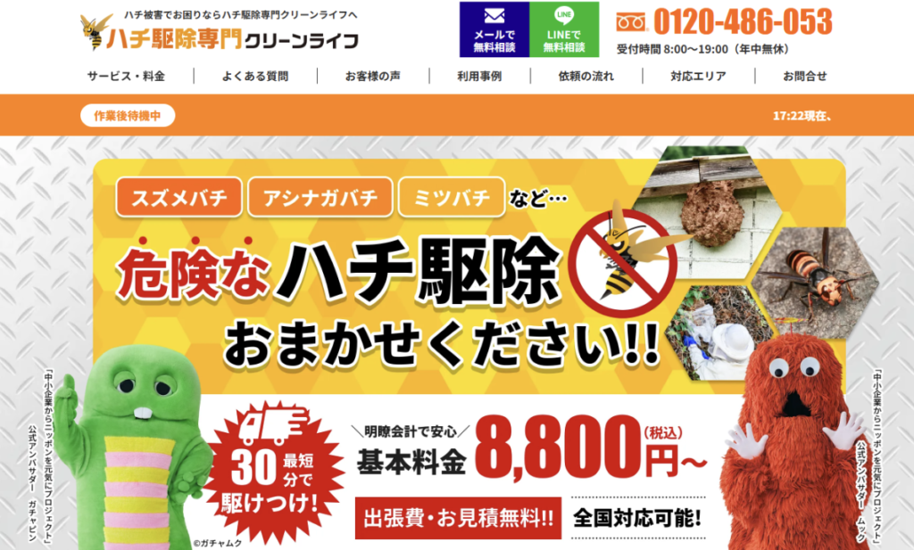 早朝や夜間でも対応可能な「ハチ駆除専門クリーンライフ」
